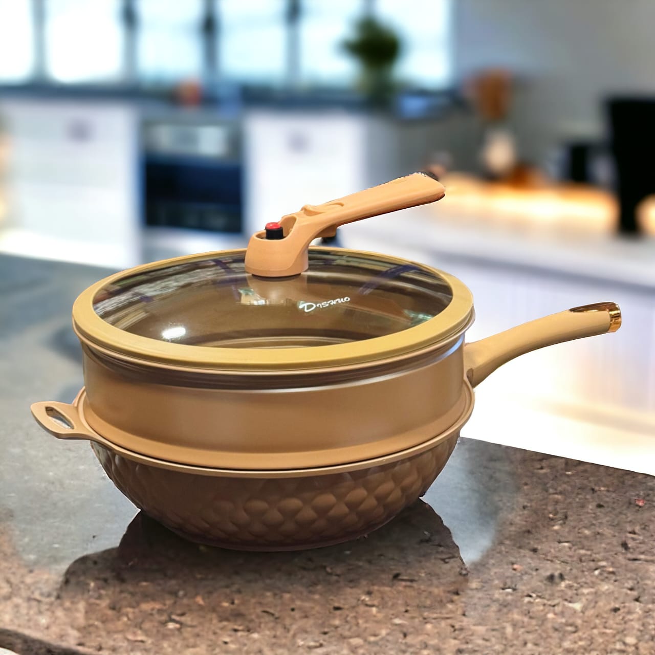 • Wok Pan with Lid - Easy to Clean and Maintain】Cleaning up after cooking is a breeze thanks to the pressure pot non-stick surface. The woks & stirfry pans nonstick is also dishwasher safe for added convenience.Designed for durability, this wok maintains its shape over extended use, ensuring consistent cooking performance.