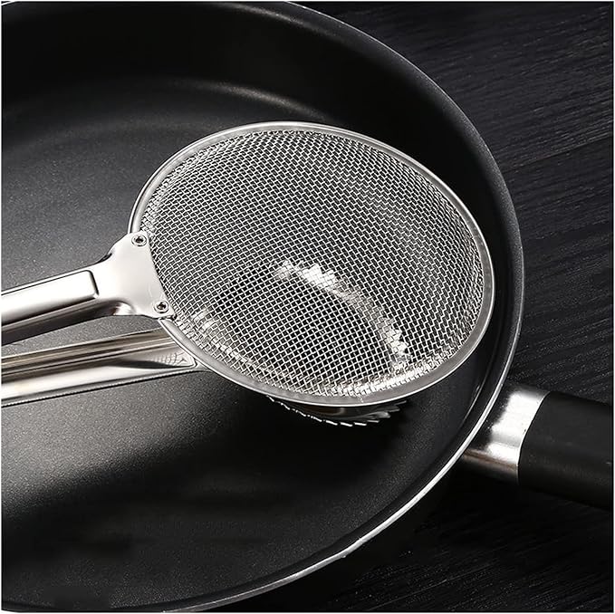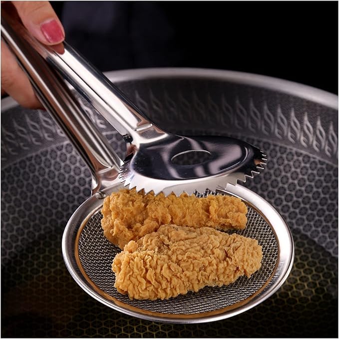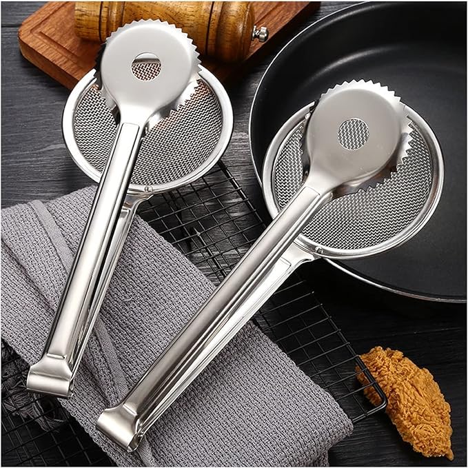• Stainless steel grill/fry tongs feature special draining holes on the tips so that fats and oils easily fall through.