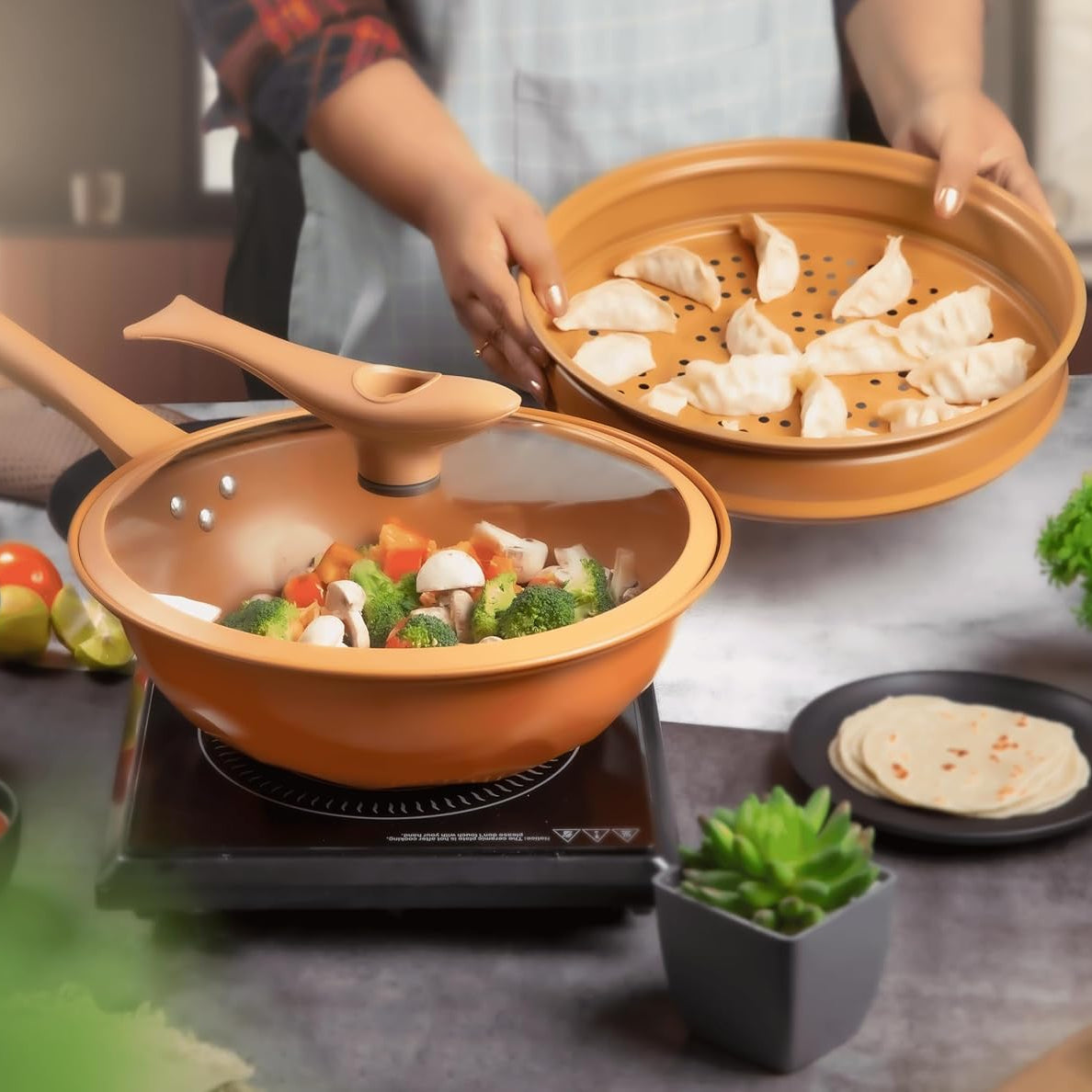 •  Micro-Pressure Technology 】 The multi-functional non-stick pan adopts new micro-pressure technology, which allows you to cook food faster through a sealed cooking environment while retaining the nutrition and flavor of the food itself.