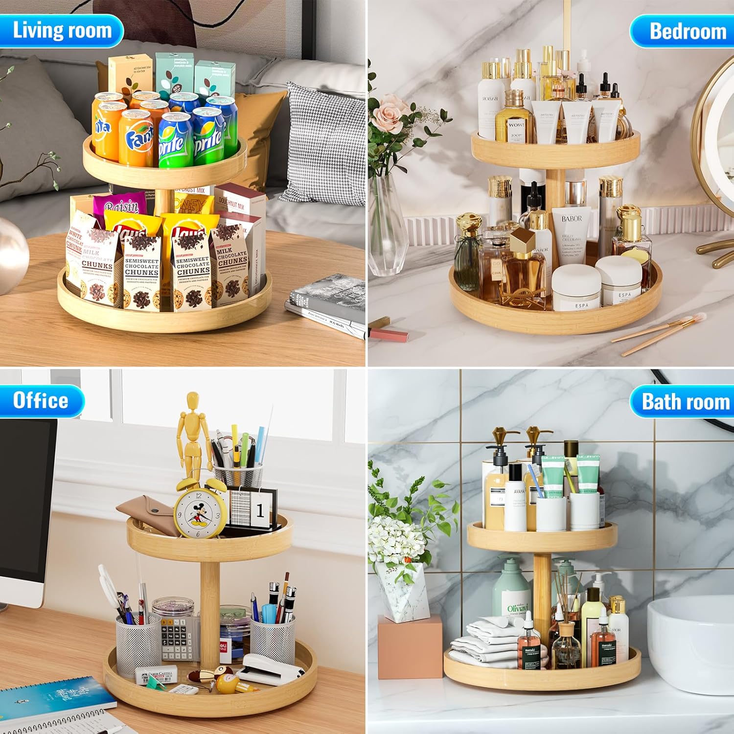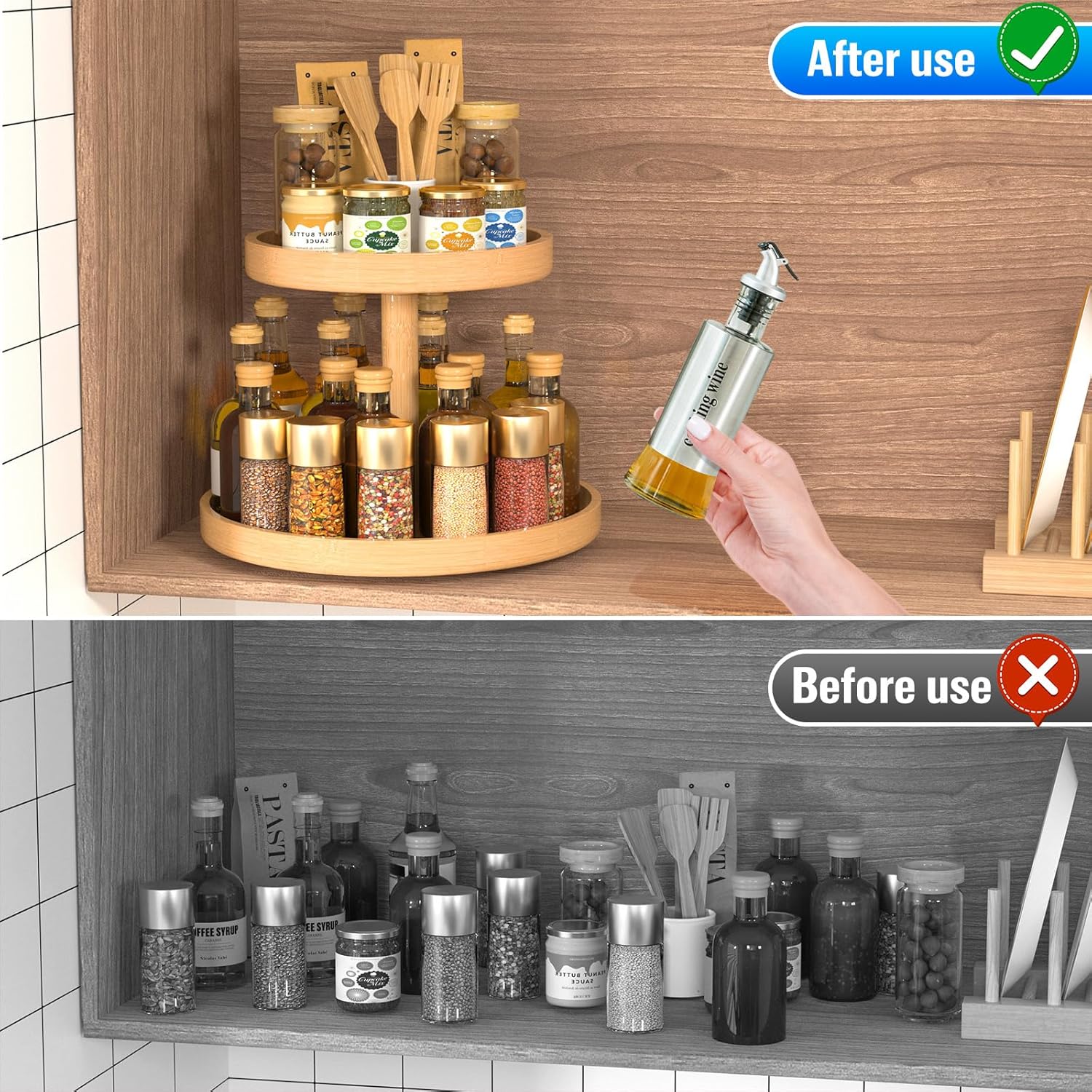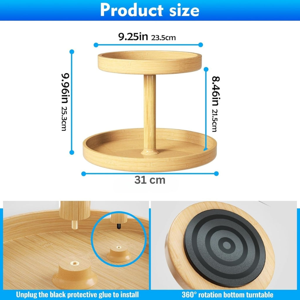 2-Tier Bamboo Lazy Susan Turntable Organizer, ideal for enhancing storage in cabinets, pantries, countertops, kitchen islands, and tabletops. This organizer effortlessly holds spices, cans, and various pantry essentials.