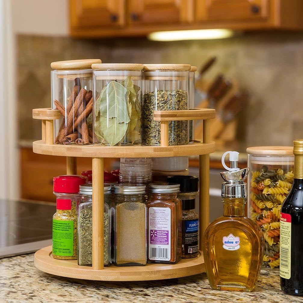 • Two-Tier spice rack made of high quality Bamboo wood and a great addition to your kitchen cabinet, counter top and pantry