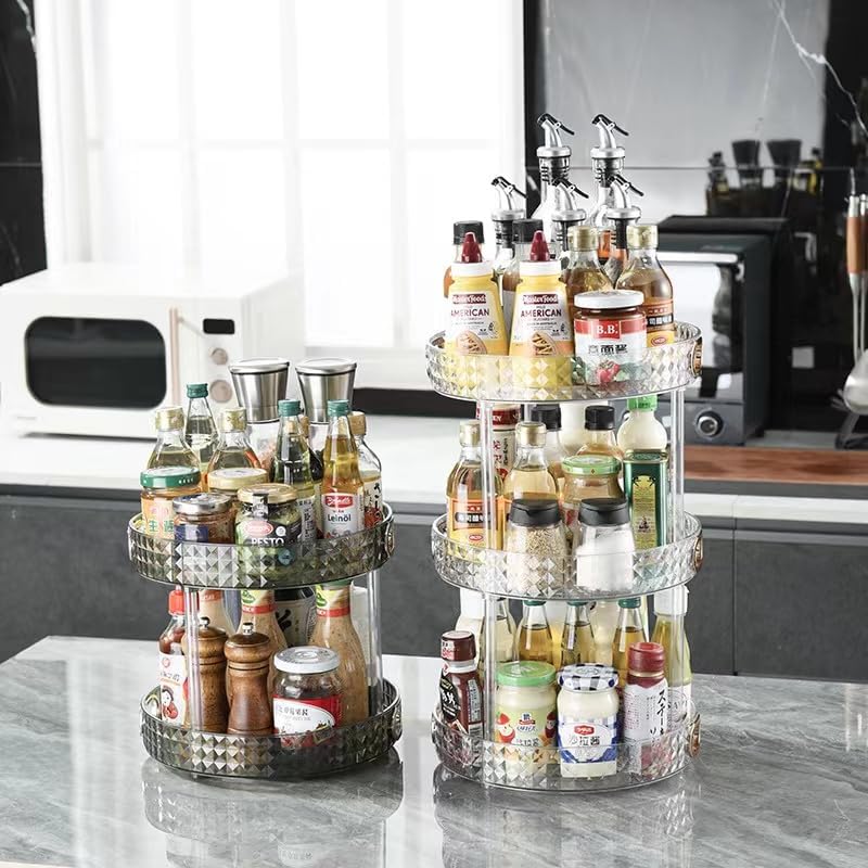• REDUCES CLUTTER: Save time getting ready and maximize space;This rotating organizer is perfect for optimizing storage in bedroom dresser or Vanity Countertop, it's also suitable for kitchen, living room to store condiments, spices, bottles, cans, drinks, coffee, baking supplies, snacks, shampoos, bathroom necessities , makeups to keeps clean and tidy