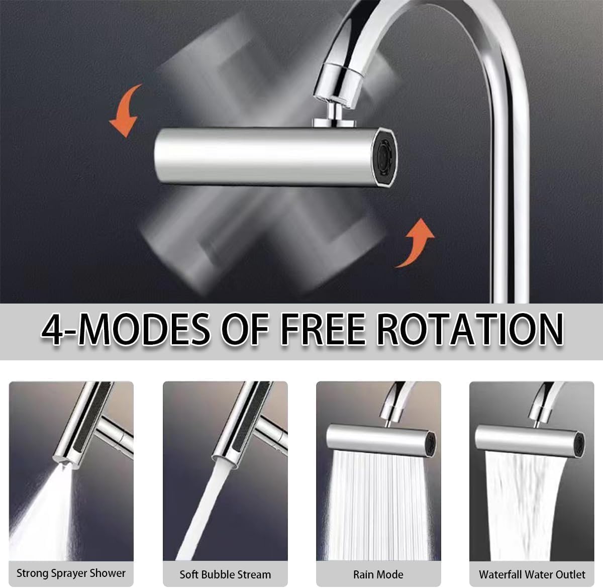 • 4-in-1 Water Outlet Faucet - The kitchen faucet sprayer head replacement has 4 water outlet modes.You can switch these 💧modes by rotating them to match different usage scenarios.Unique-designed waterfall mode with wider cleaning range, it's simple and convinient to wash fruits and vegetables;Power mode is perfect for rinsing dishes, making them easier to clean;Shower mode provides a gentle stream of foam that is soft and no splashing.