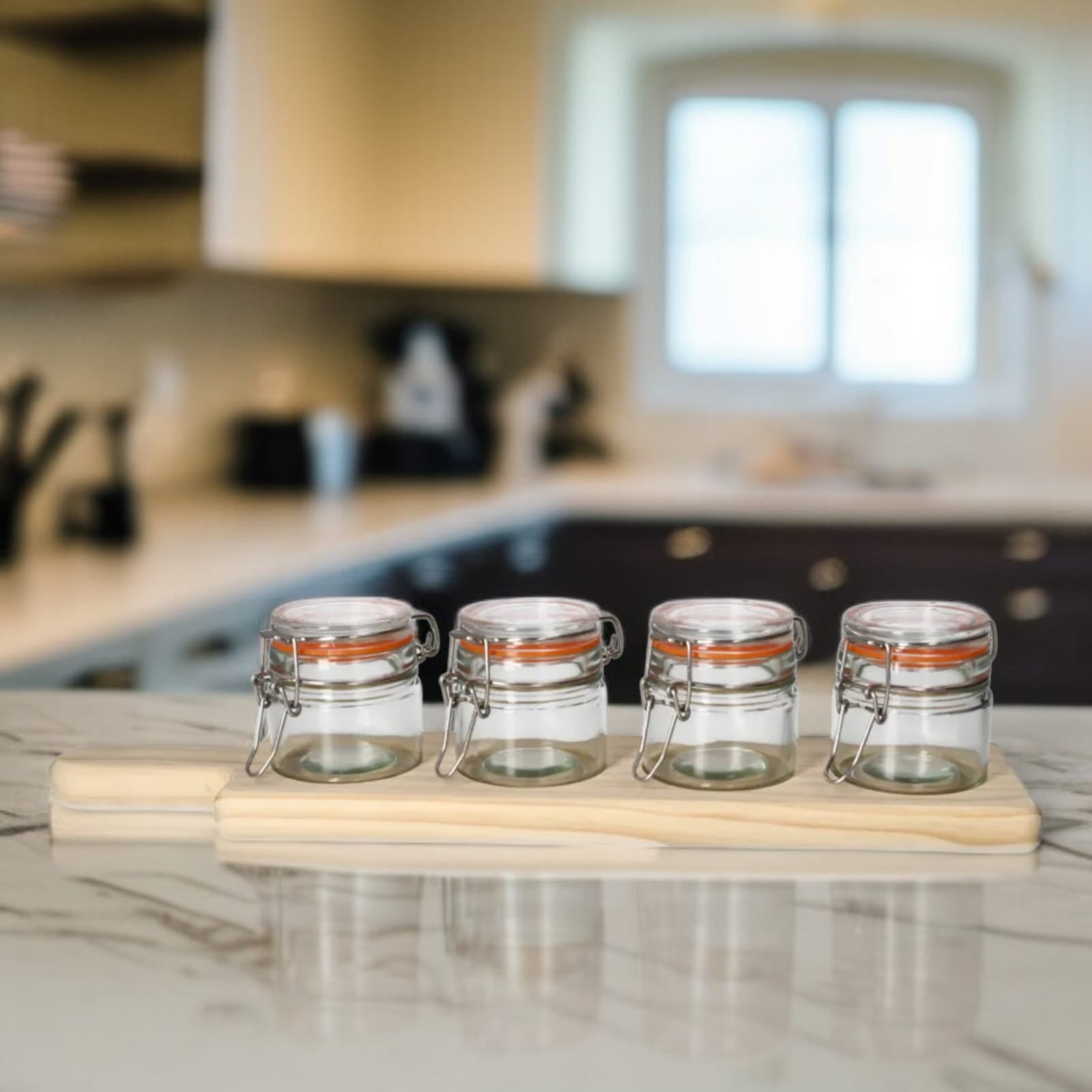 The product is a set of glass jars with flip-top lids on a wooden serving tray. These sets are often used for serving spices, condiments, or dips.