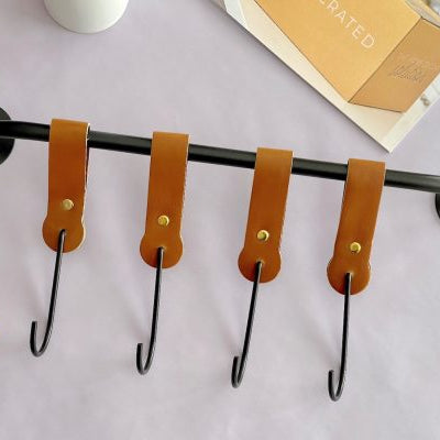 A wooden cookbook or recipe stand featuring a black metal handle and leather hanging loops is on the right.