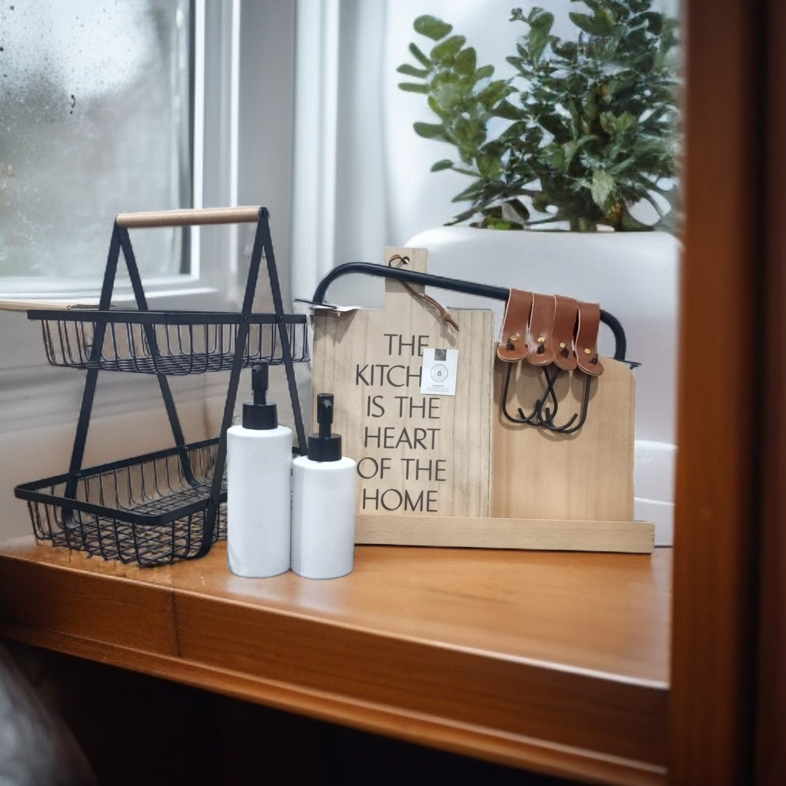 The image displays a collection of kitchen organization and decor items arranged on a wooden surface.