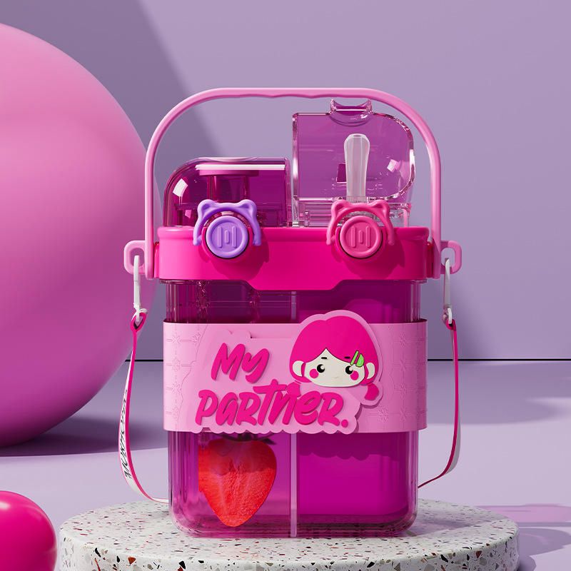 This 760ml cute children's cartoon plastic water bottle is perfect for students, featuring a portable handle and straw design. It supports direct drinking and is made of eco-friendly PC plastic, suitable for various occasions like school, travel, and outdoor activities.