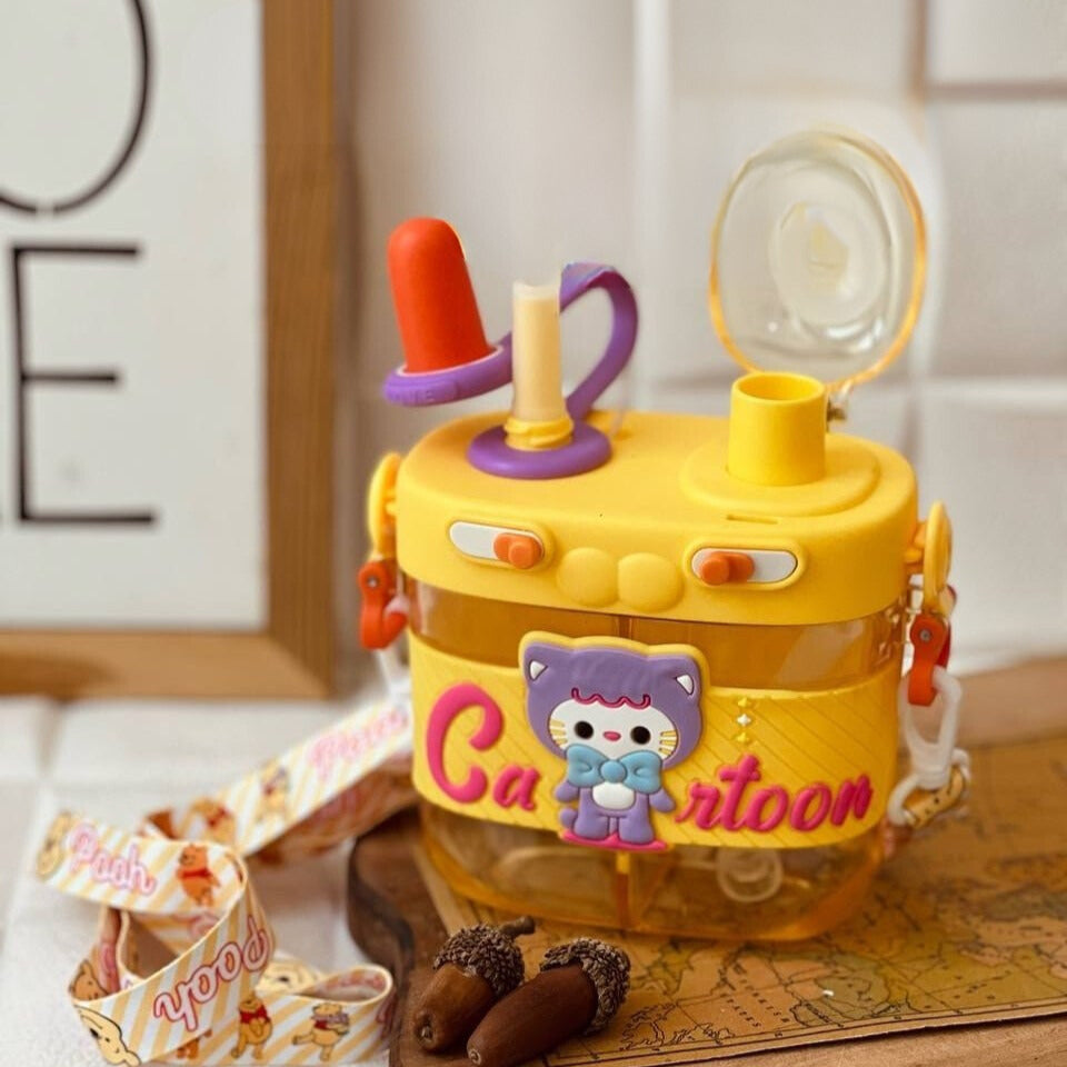 The product shown is a "Cartoon" branded double-drinking water bottle for children. It is designed with two separate compartments to hold different beverages simultaneously.