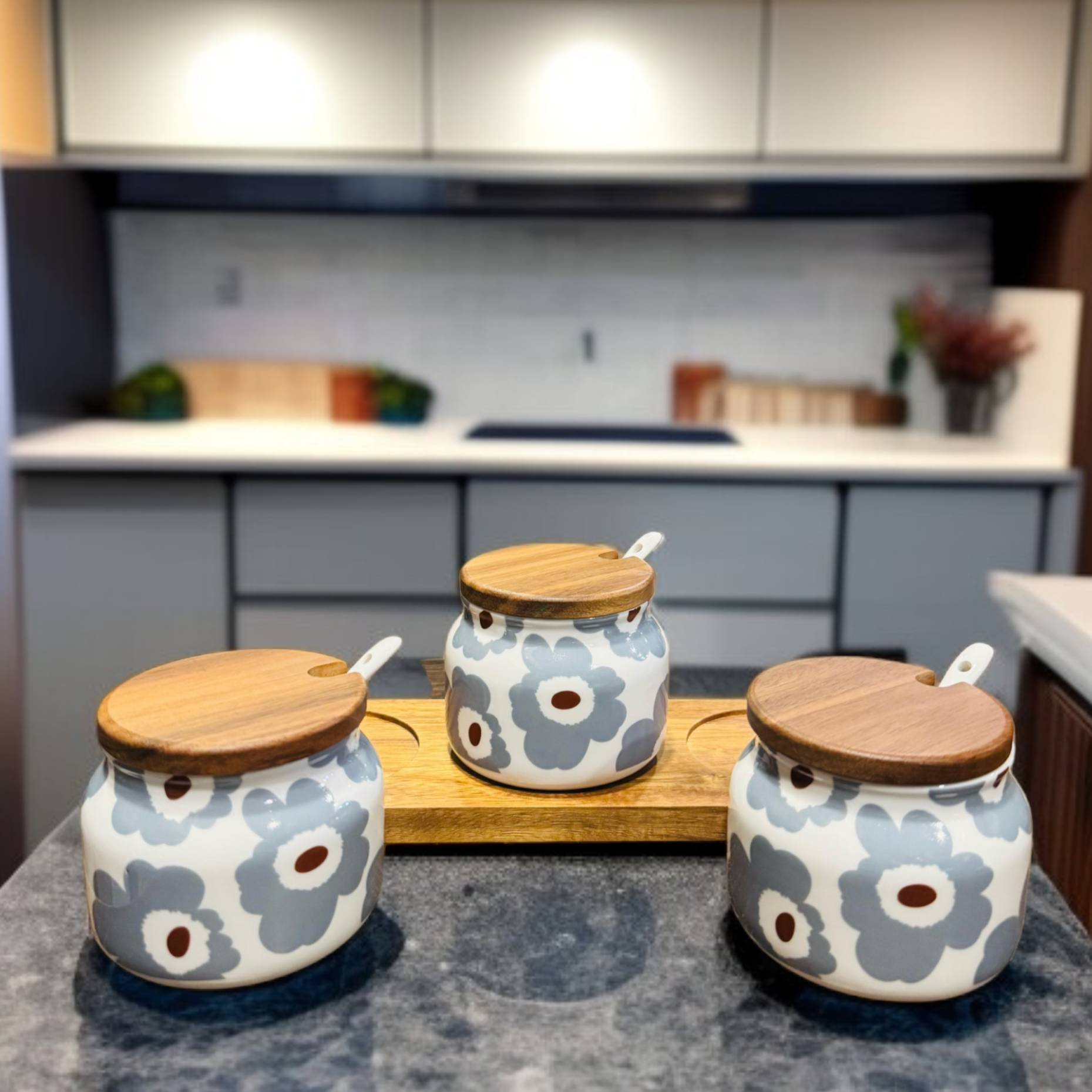 Ceramic Seasoning Pot with Wooden Lid 3 Pcs Pots Set with Wooden Tray High Quality Ceramic Material...