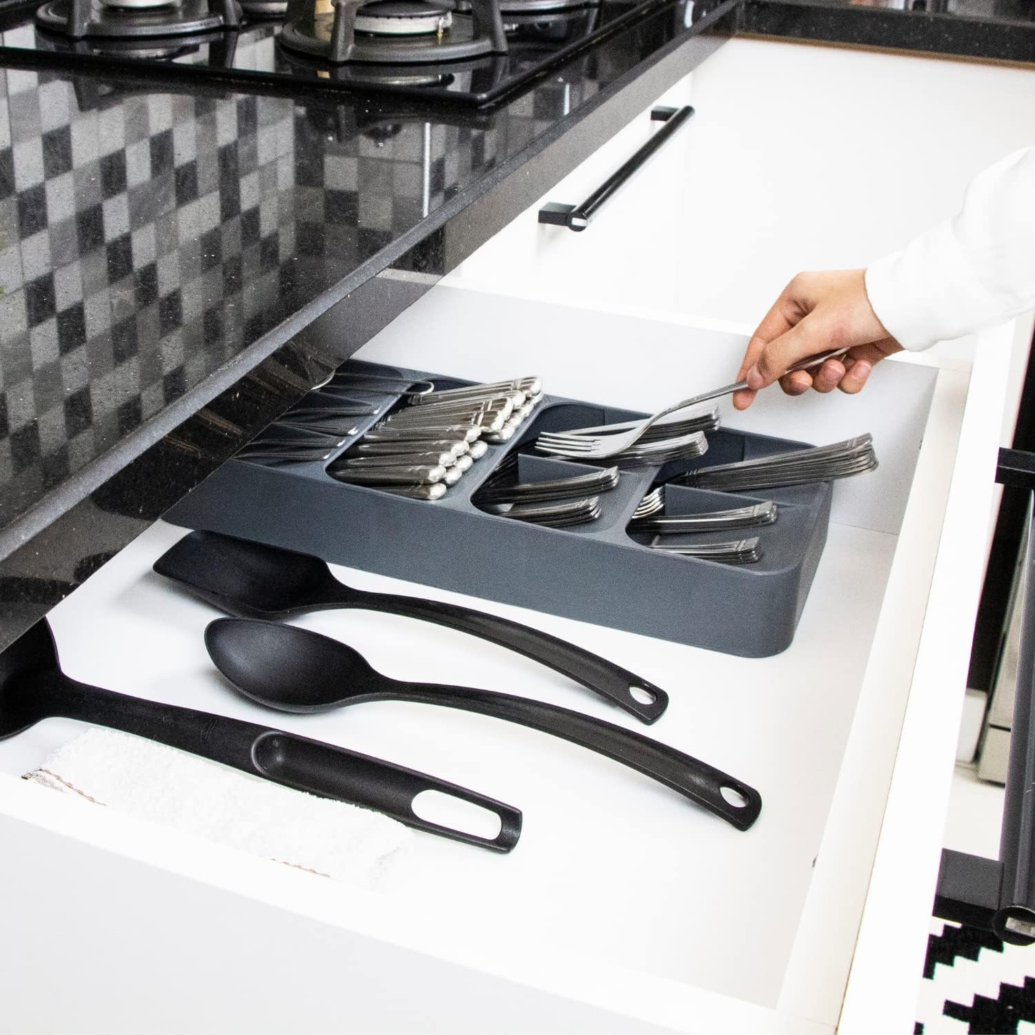 Store more cutlery or knives in less space with a Compact Organizer! Smart cutlery storage angles and layers each compartment so you can stack loads of spoons and forks, plus serving pieces, peelers and more. Items can be placed either head or handle first. Has icons for easy identification. Compact knife organizer safely stores large knives on the lower level and small knives on top.