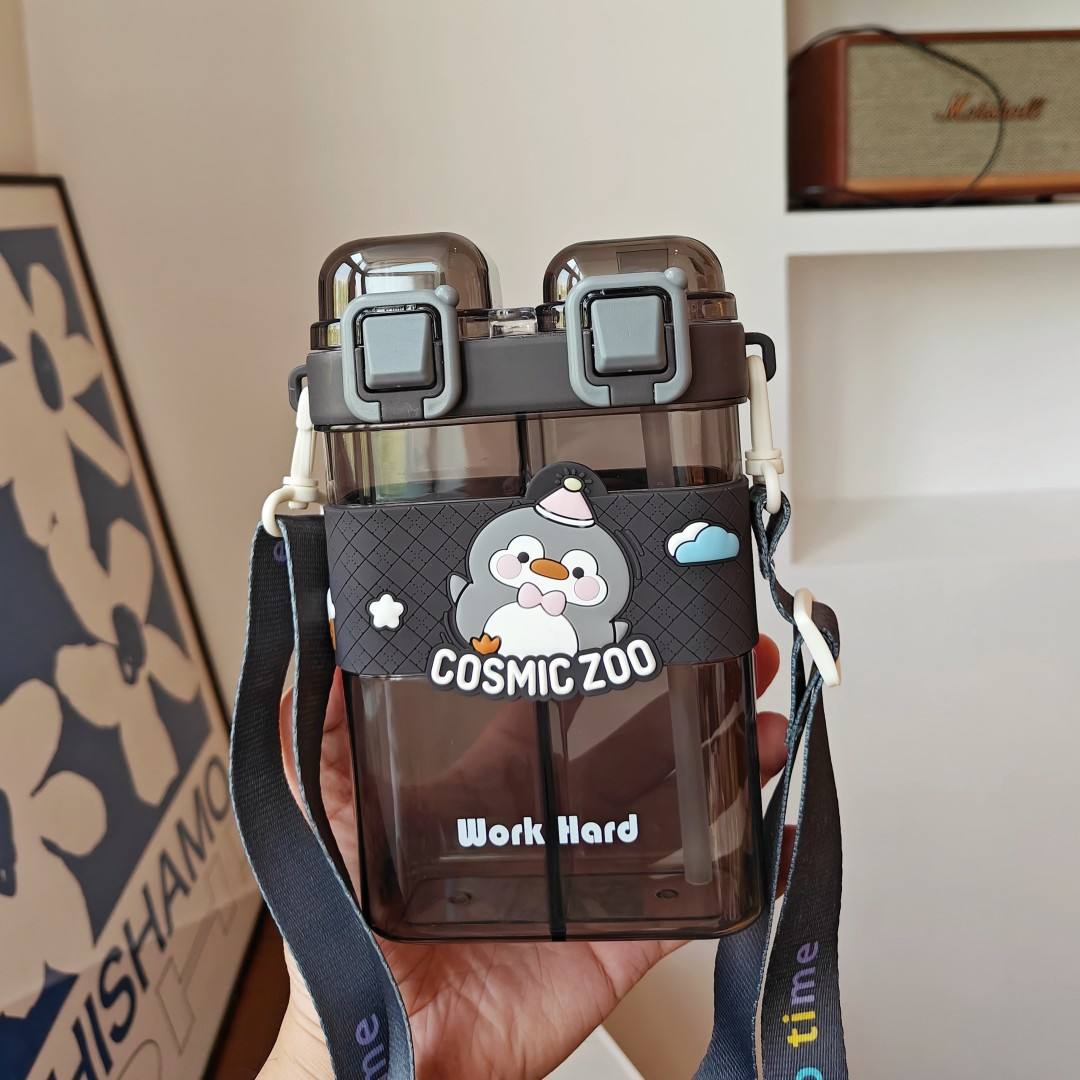 Cute Portable cartoon kids plastic double drinking tumbler cups with divider, made of food-grade PC material, ensure safety and durability. With a 750ml capacity and multi-color options, it's ideal for outdoor activities like hiking, gym, and camping. Features include eco-friendly design, straw-type water flow, and modern style suitable for unisex use.