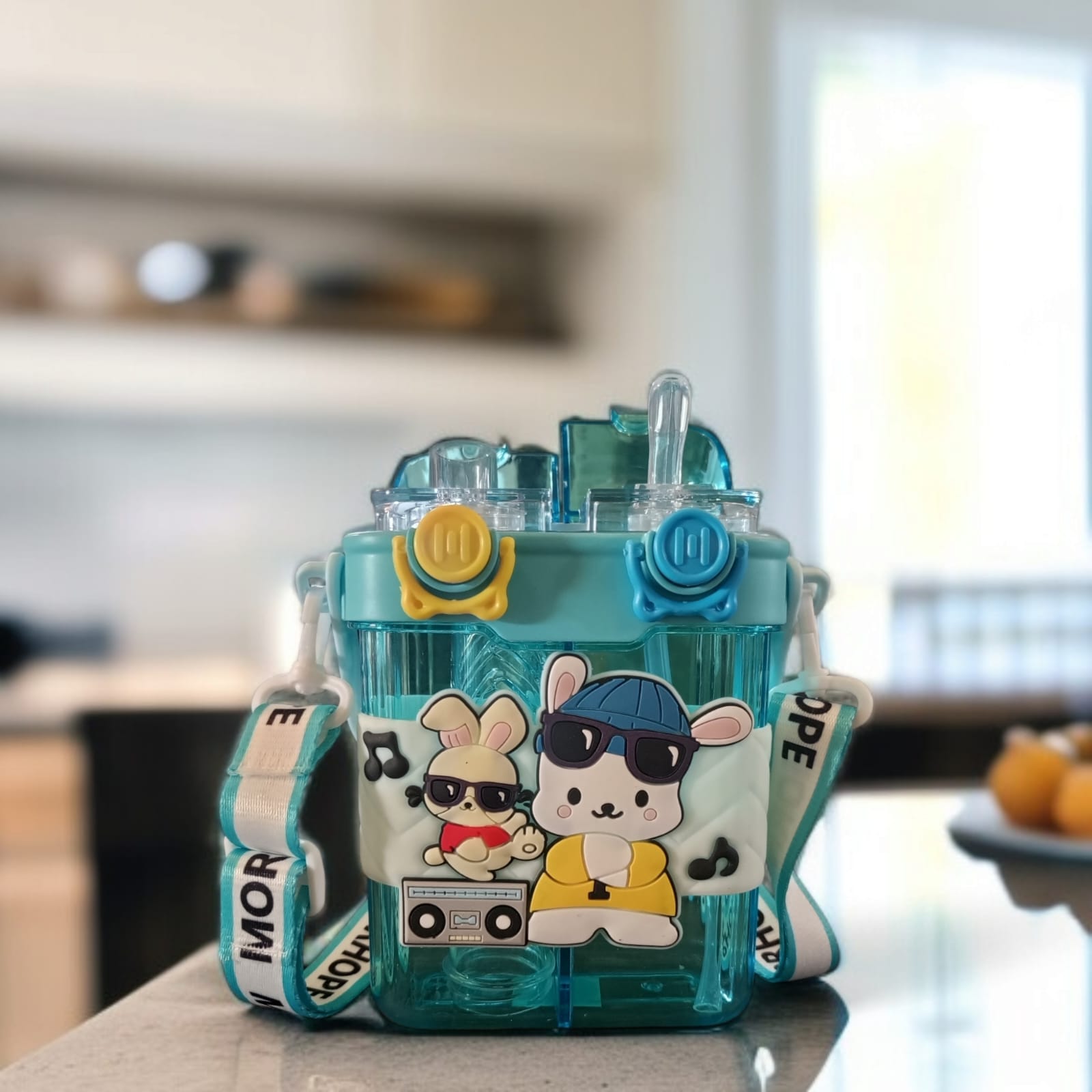• The bottle has a double drinking straw design and a flip-top lid