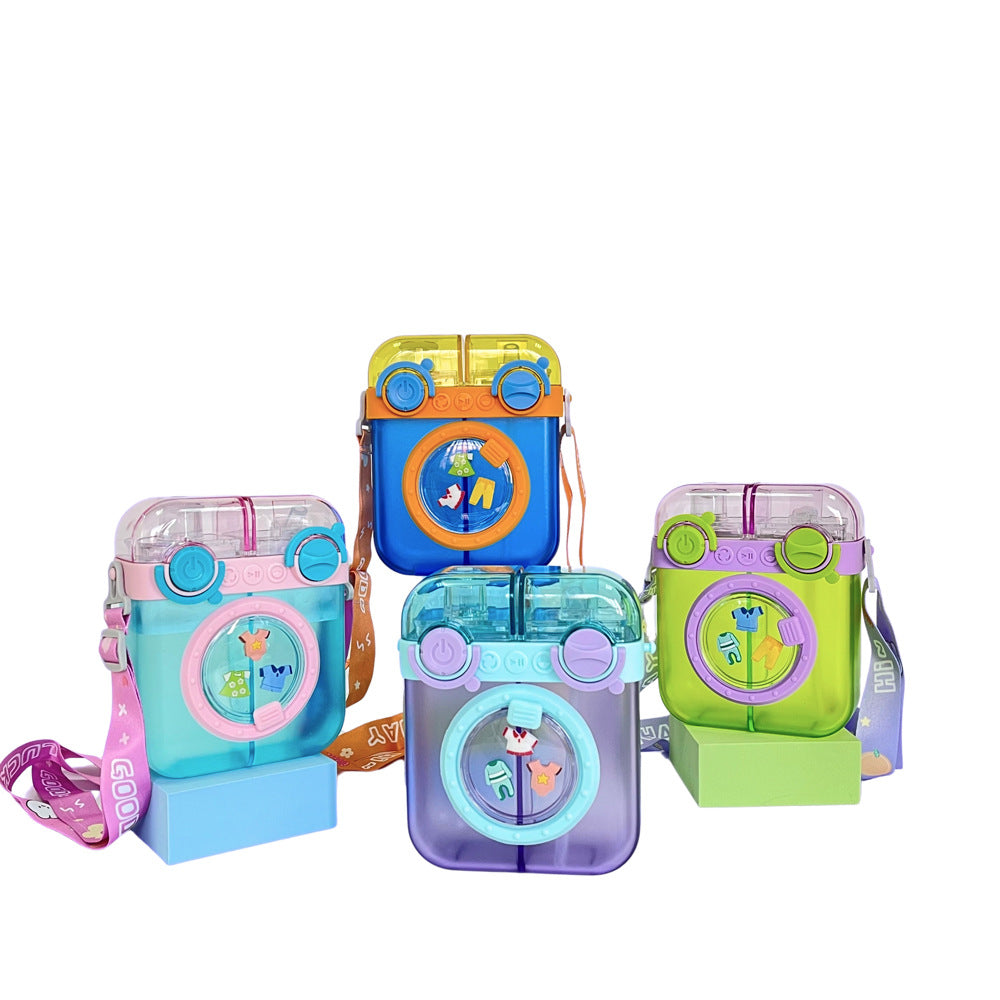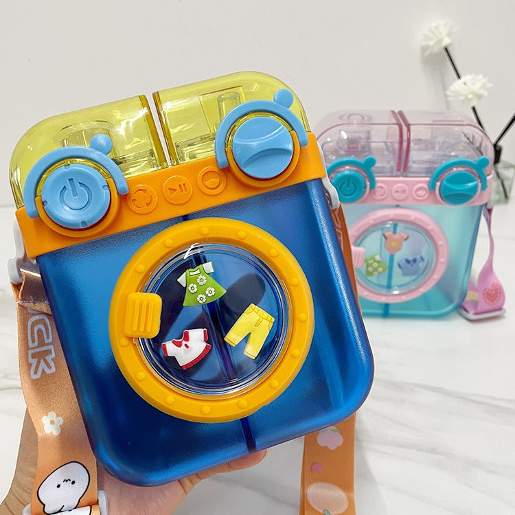This is a double-compartment water bottle designed to look like a miniature washing machine. It is typically made from BPA-free plastic and features a wide mouth for easy cleaning and adding ice cubes.