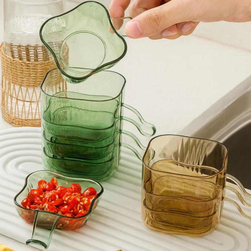 The handles give a comfortable grip when moving the bowls around. The bowls stack on top of one another, saving space in your kitchen cabinet. Take them out for lunch, dinner, or parties. The transparent sauce dip bowls set complements any table decor. Use the bowls for ketchup, chutney, salsa, or even nuts and small snacks.