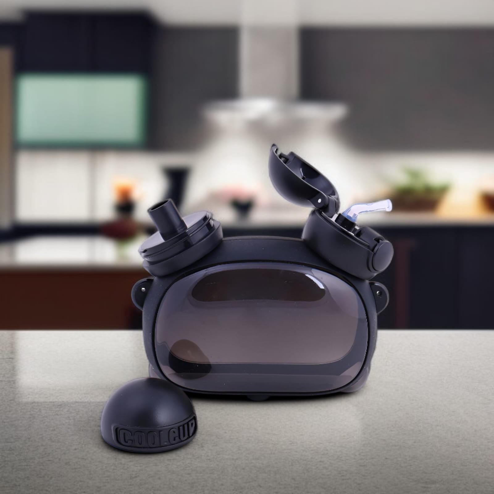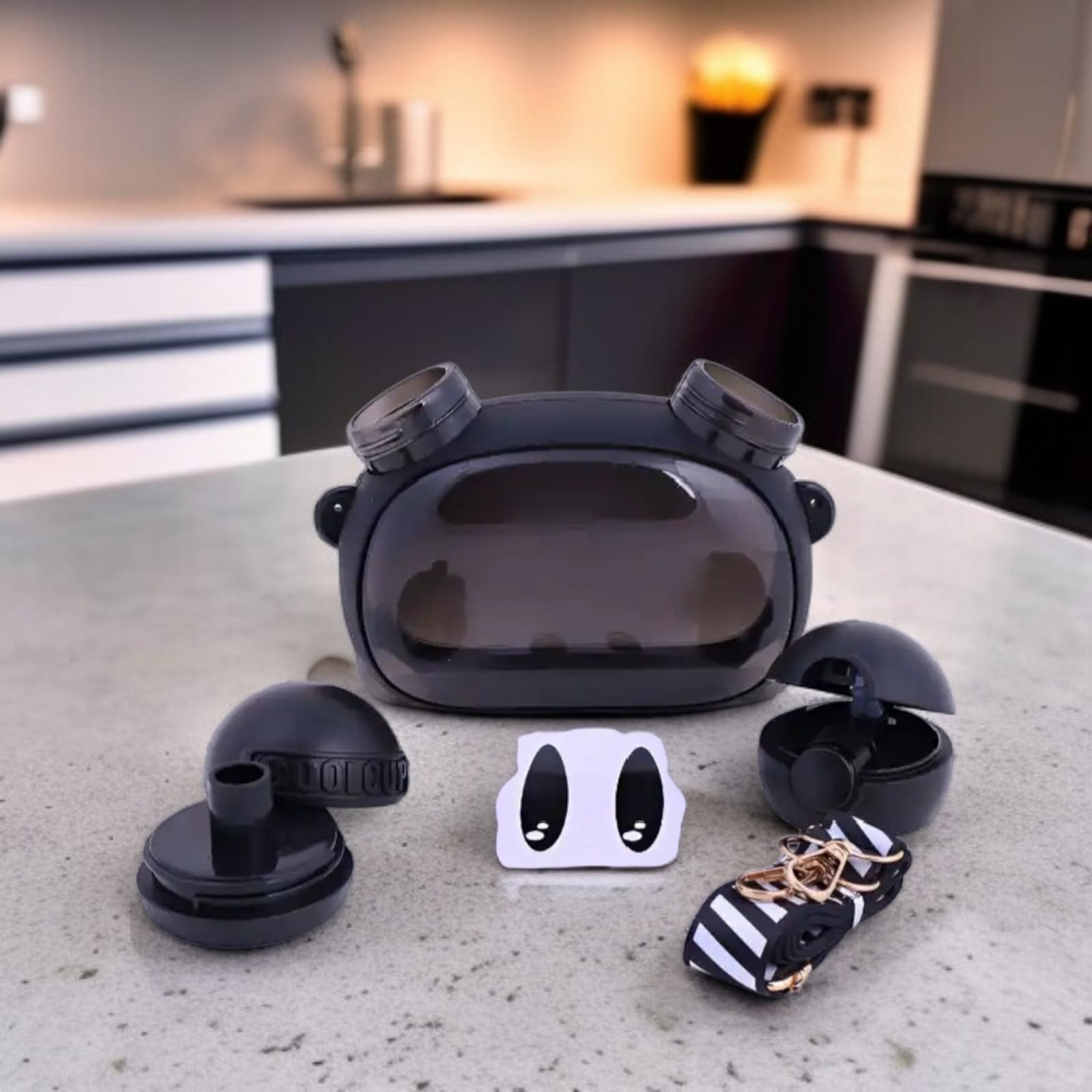 This is a is a kids' water bottle made of plastic with a sipper and a strap for carrying. It has a dual-compartment design, allowing for the separation of different drinks. The bottle is designed to be leak-proof with a safety lock on the straw to prevent spills. The capacity of this particular style is approximately 800ml, and it is made from food-grade, non-toxic, and BPA-free plastic.