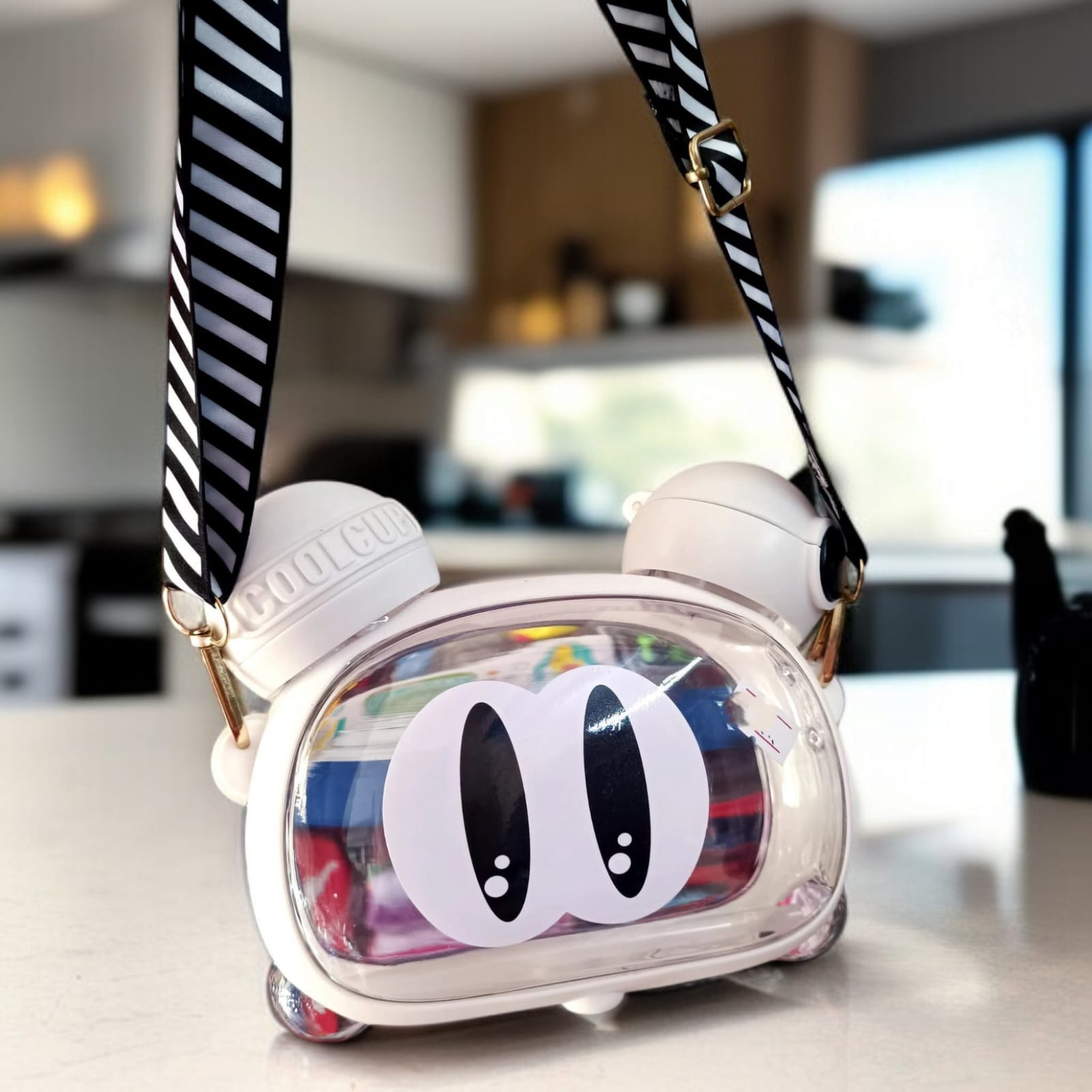 This is a is a kids' water bottle made of plastic with a sipper and a strap for carrying. It has a dual-compartment design, allowing for the separation of different drinks. The bottle is designed to be leak-proof with a safety lock on the straw to prevent spills. The capacity of this particular style is approximately 800ml, and it is made from food-grade, non-toxic, and BPA-free plastic.