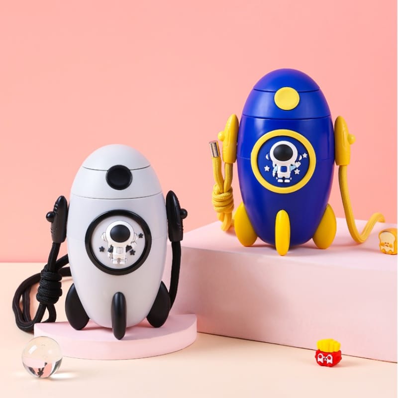 This is a rocket-themed water bottle. It is designed for kids and features a fun, colorful rocket...