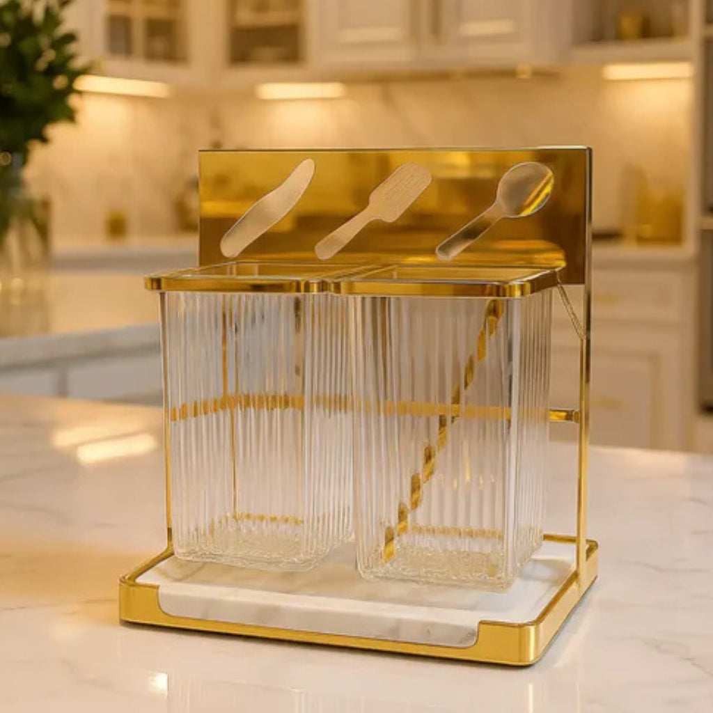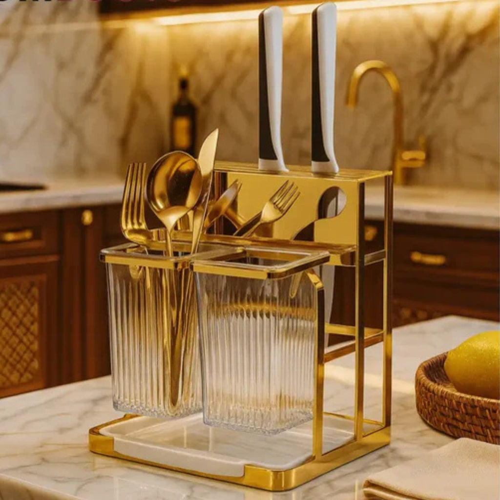 • Stainless Steel ABS plastic Clear + Gold Spoon and Fork Cutlery Holder