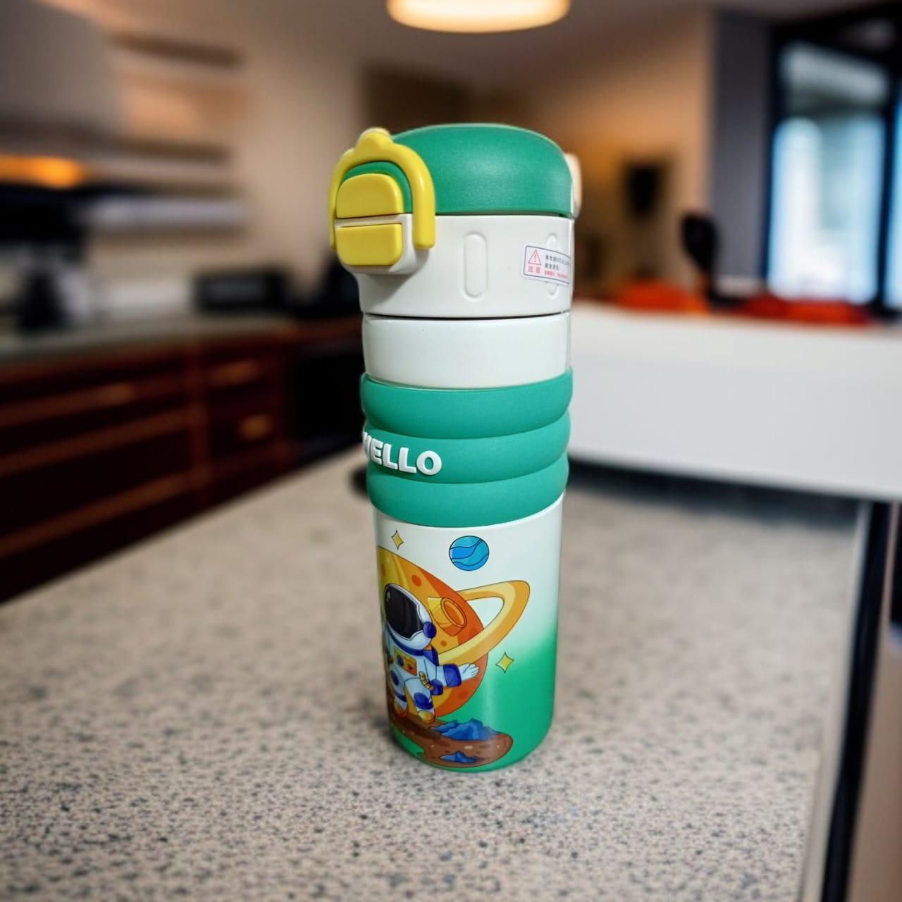 The bottle is designed for children and features a graphic of the characters. The bottle has a double-walled, vacuum-insulated design to keep drinks hot or cold and includes a leak-proof lid, a strap for easy carrying.