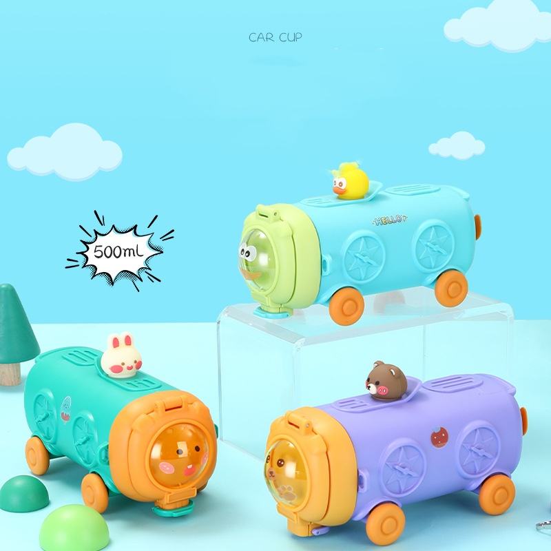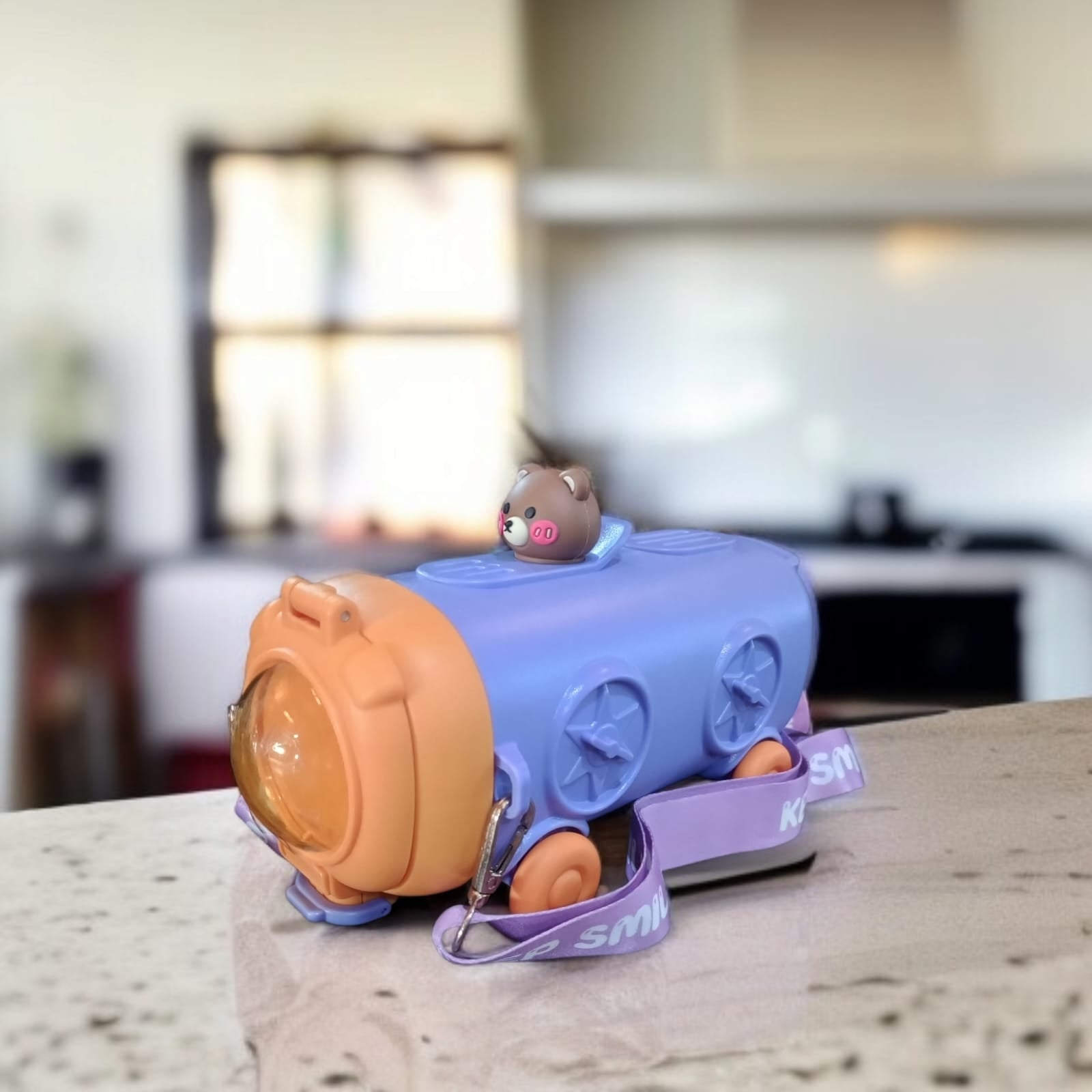 Train Figure Water Bottle 500ml". It is a children's water bottle designed in the shape of a train with a bear face, and it has a 500ml capacity. It is a leak-proof bottle that typically comes with a straw and an adjustable strap for easy carrying
